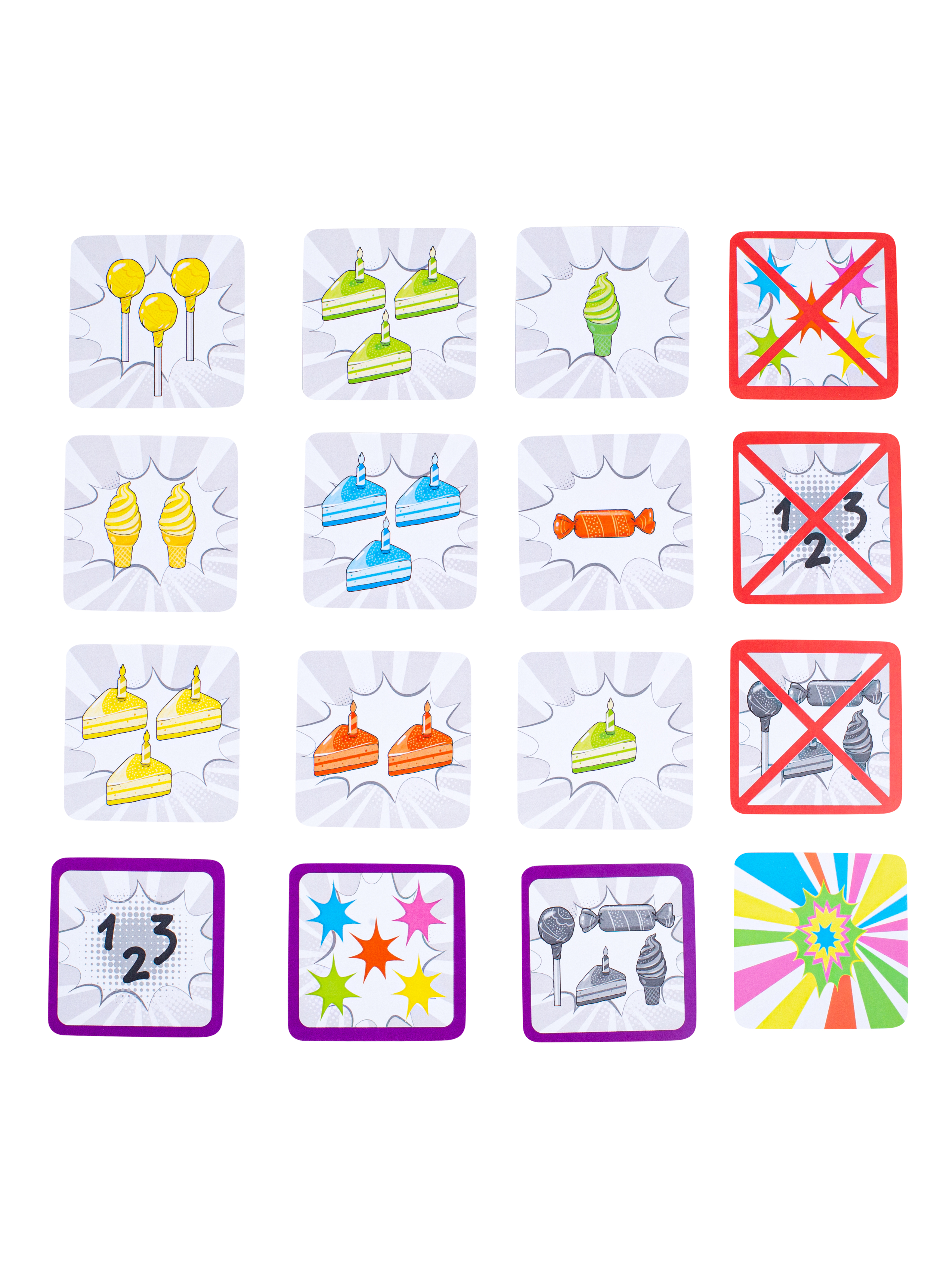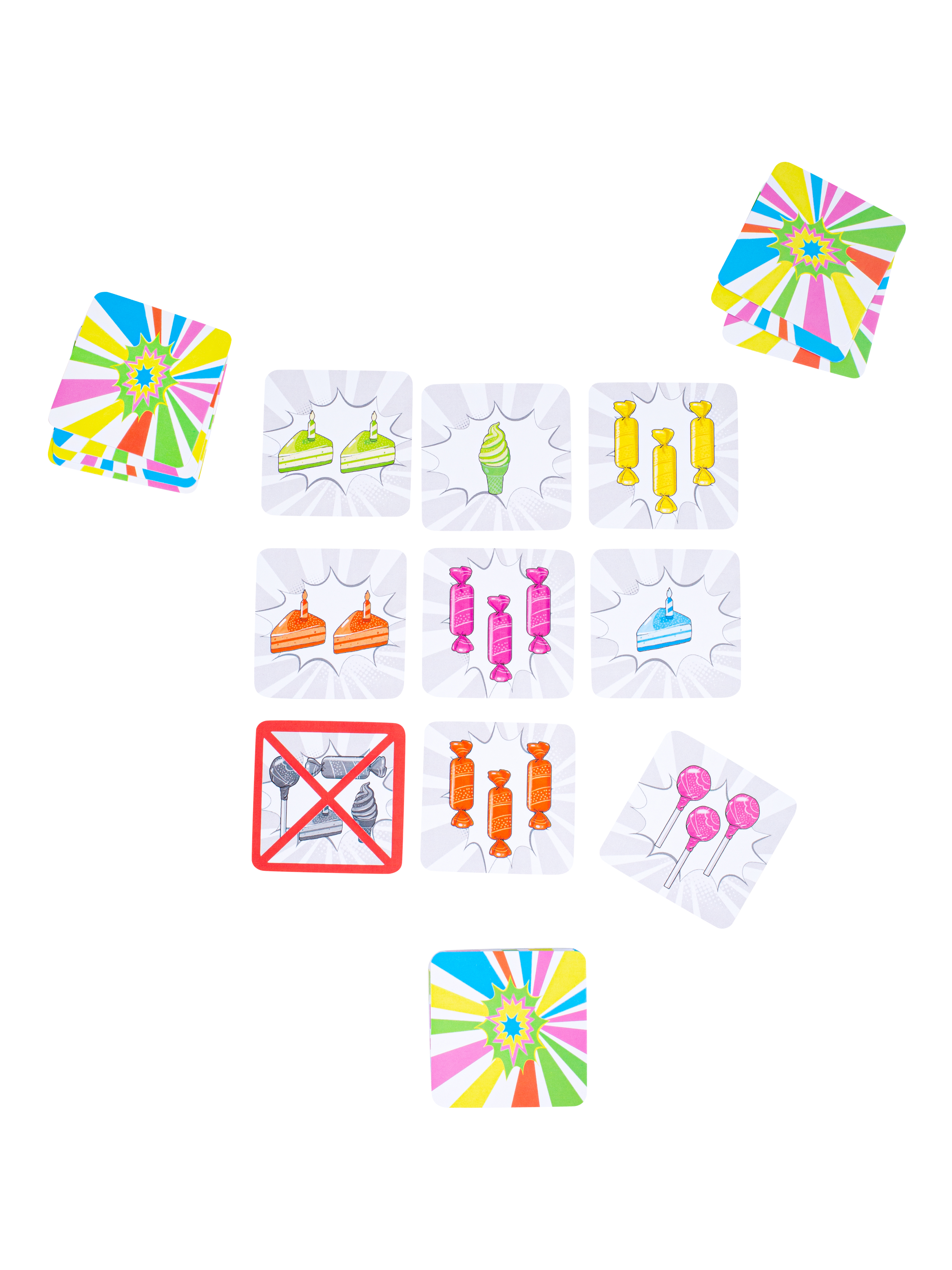 Keep track of the quantity, color, and type of sweets. Spot a match on 3 cards and name the common property—then grab the treats for your winning pile!