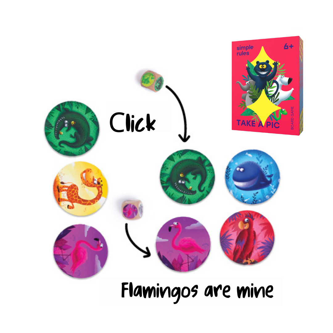 The photo safari on the table is opened; keep your eye out and your camera on! One player rolls the dies then all together tries to be first to take a pic of the animals from the dice. Hunting for new pictures don't forget to watch out for collected ones! A competitive and fast-paced game is a perfect icebreaker for kids' parties and a good filler for family time together.